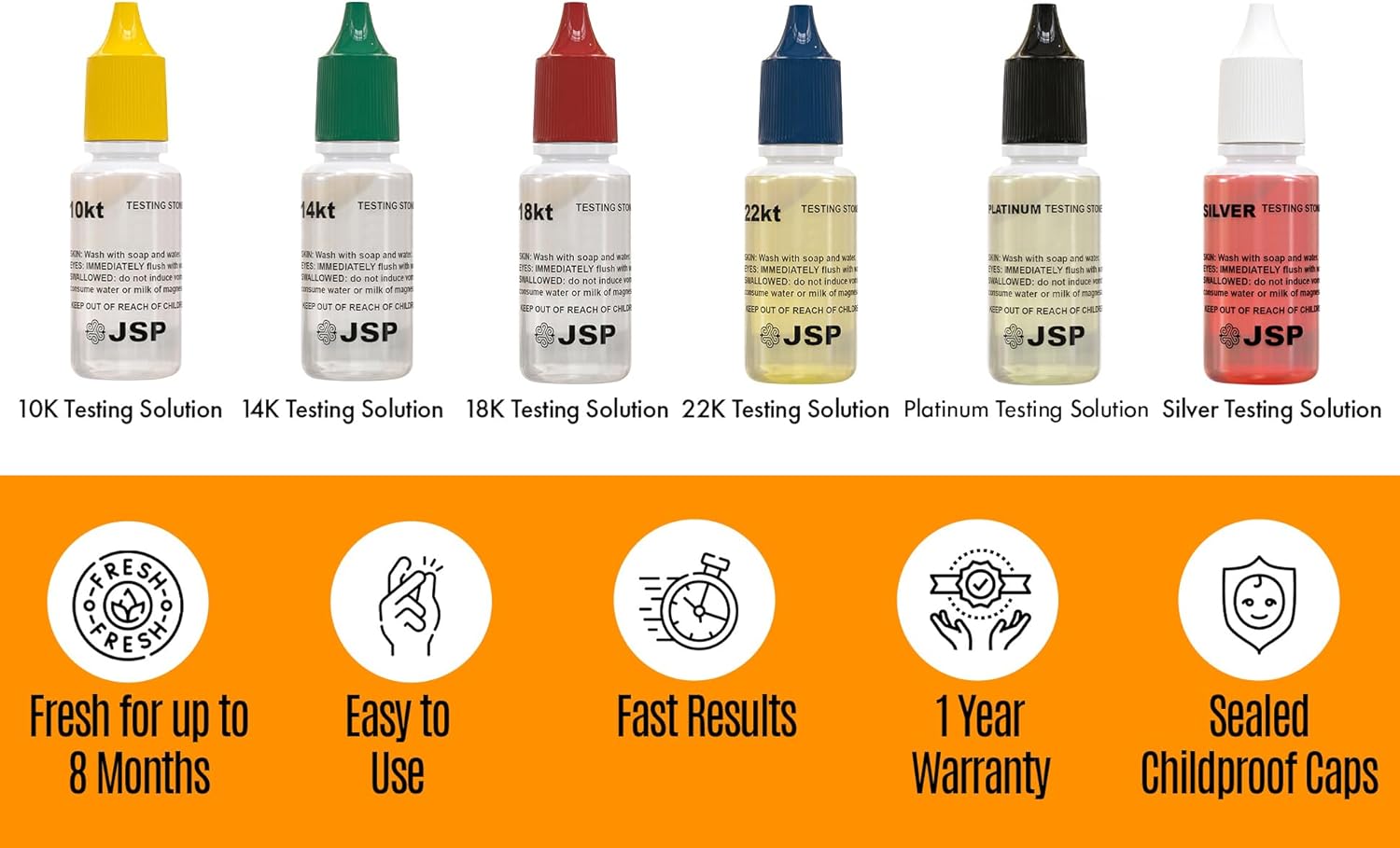 - The kit contains JSP 10K, 14K, 18K, and 22K Gold Testing Solutions, Silver Testing Solution, Platinum Testing Solution and GTE Neutralizer Solution to clean the stone between tests.
