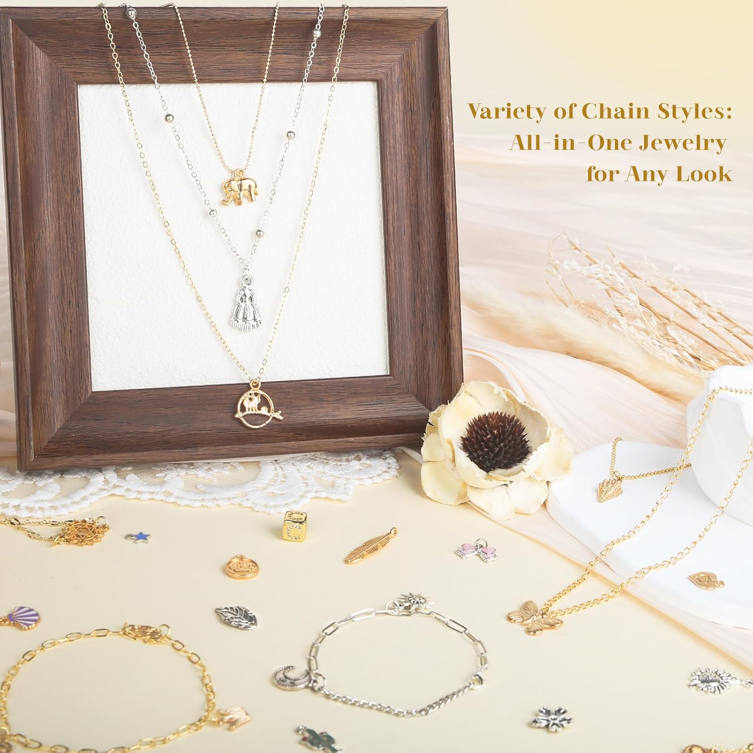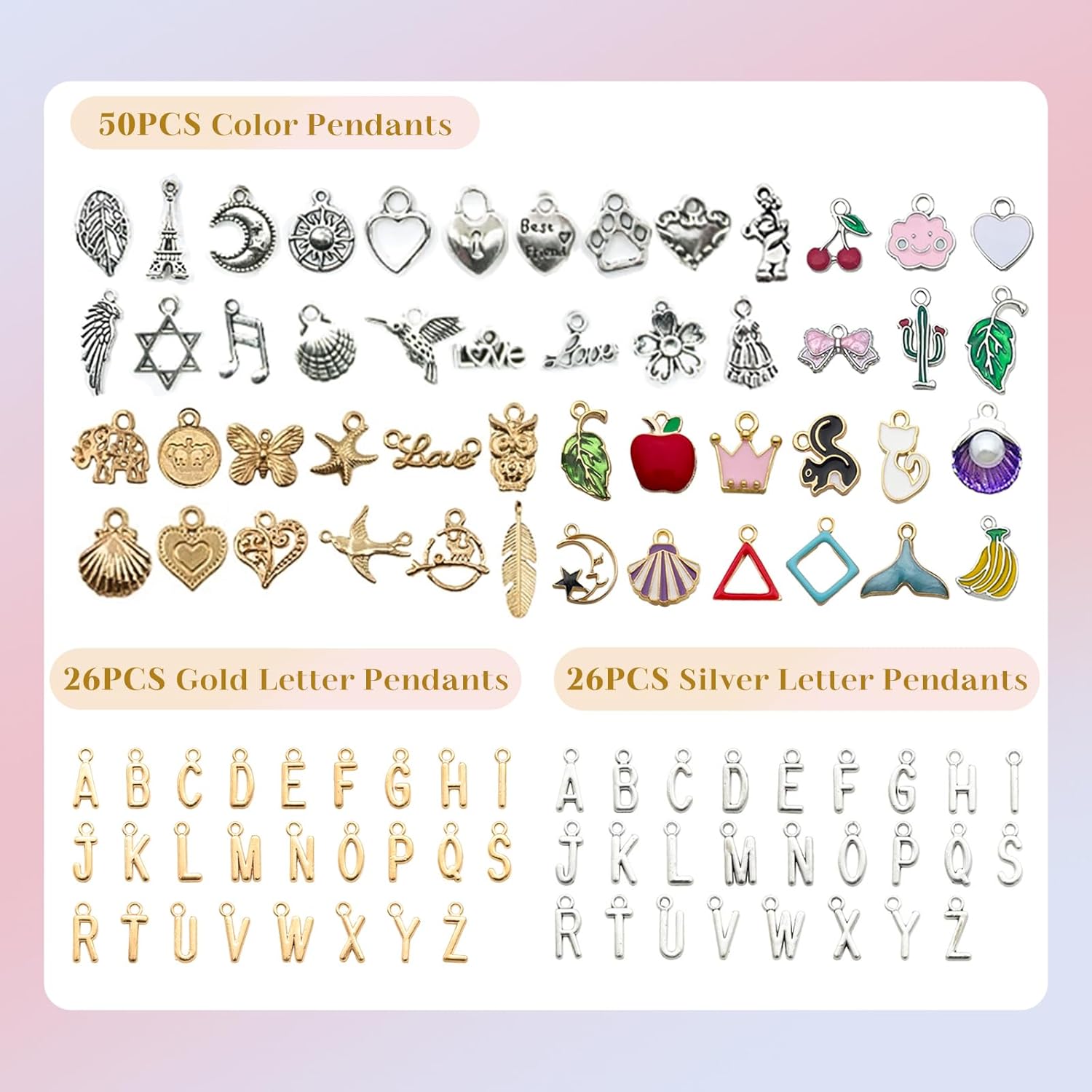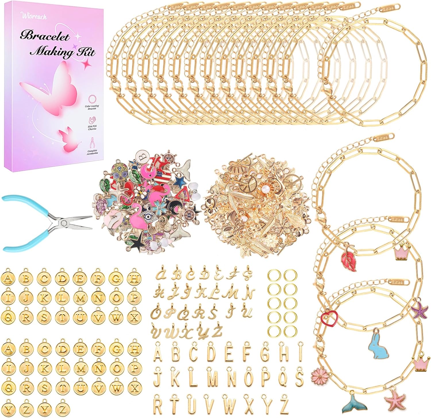 Wisreach 18K Gold & Silver Necklace Chain for Jewelry Making, 60 Feet 12 Rolls DIY Jewelry Chains, with Jump Rings, Clasps, Connectors, 52 Letter Pendants, 50 Mixed Color Pendants & Pliers